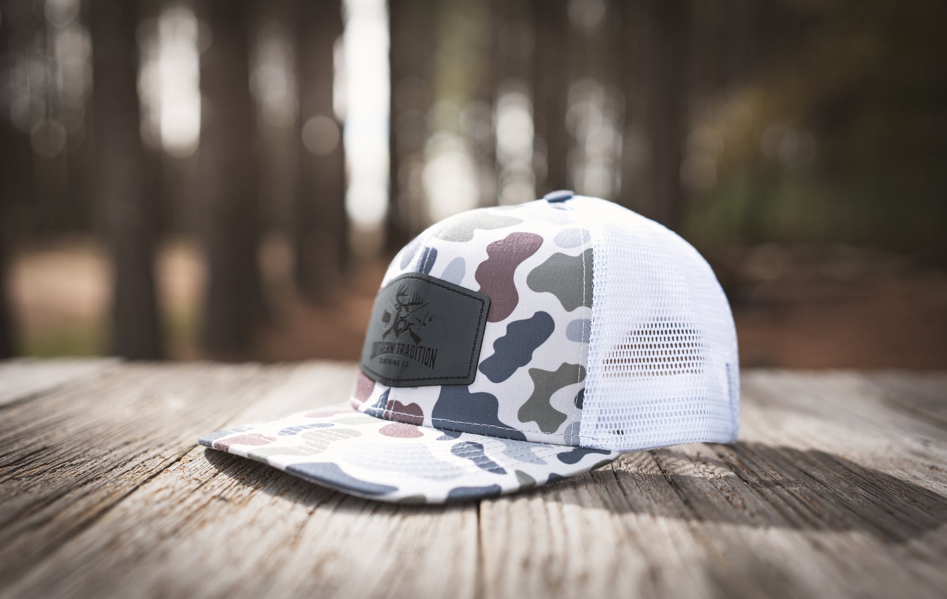 6 panel cap in brackish camo with white featuring a charcoal patch with our main logo.