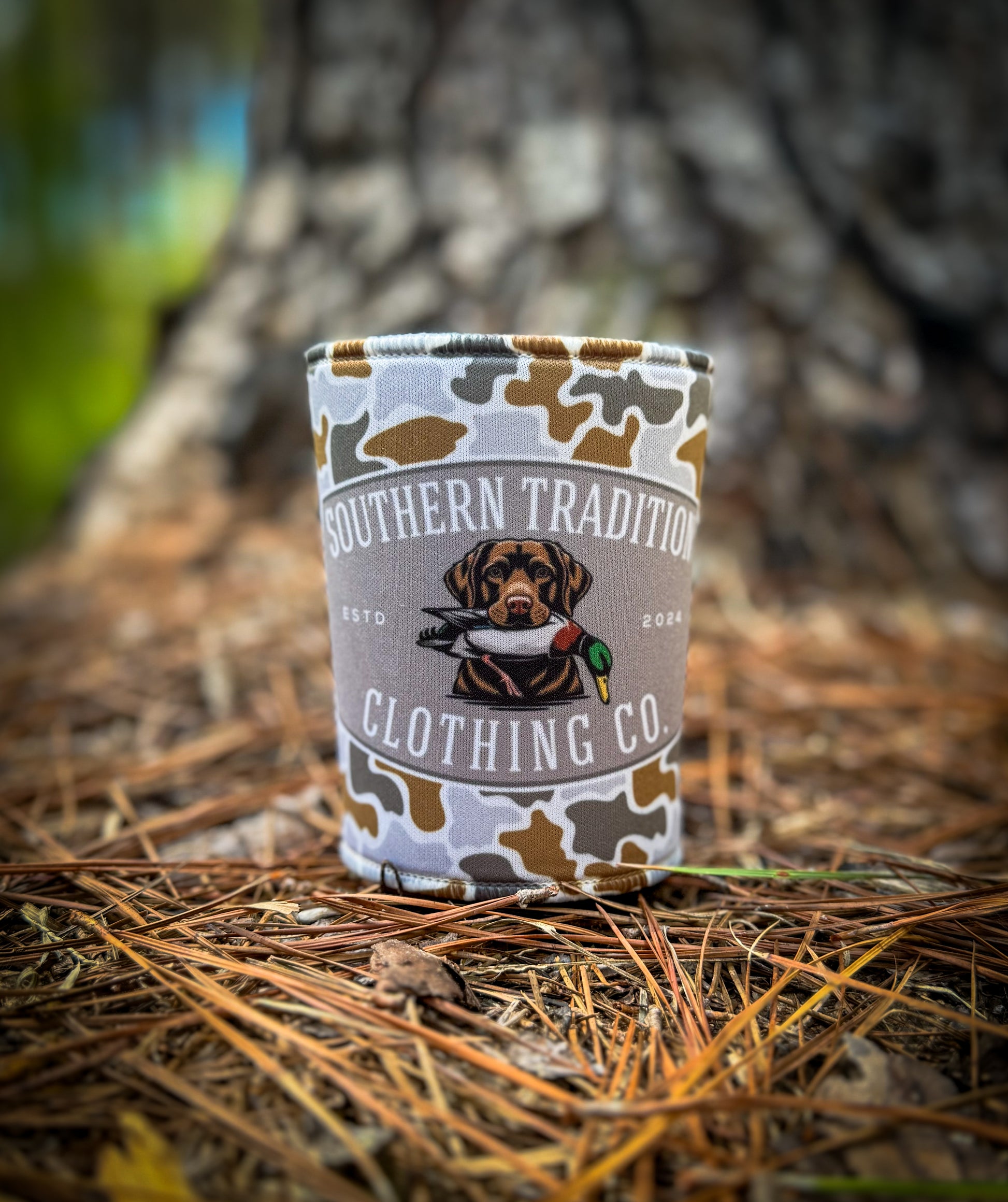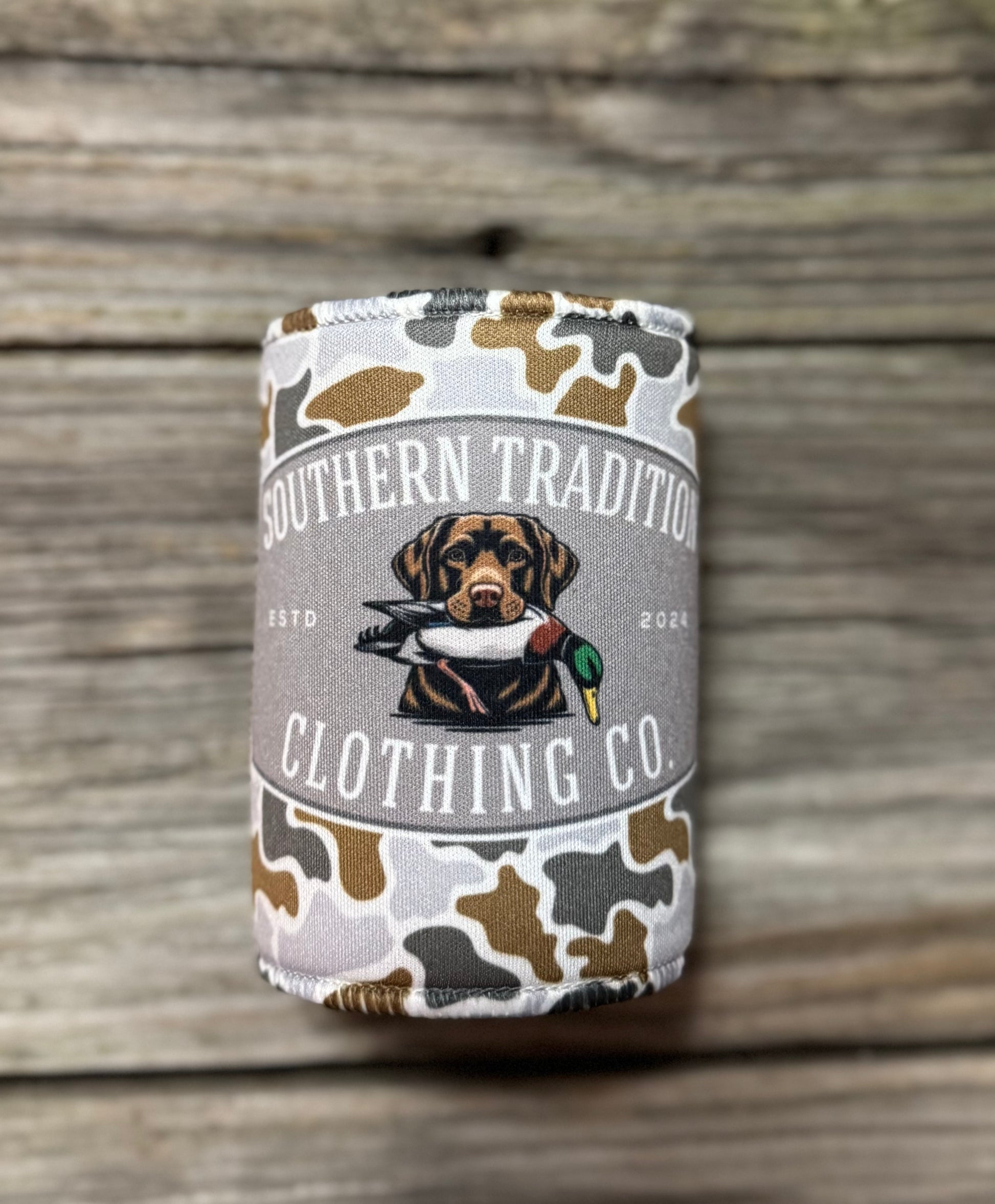 Southern Tradition Clothing Co. can coolers. Made from high quality neoprene. These coolers feature duck camo with a lab/duck logo. Perfect for any occasion!