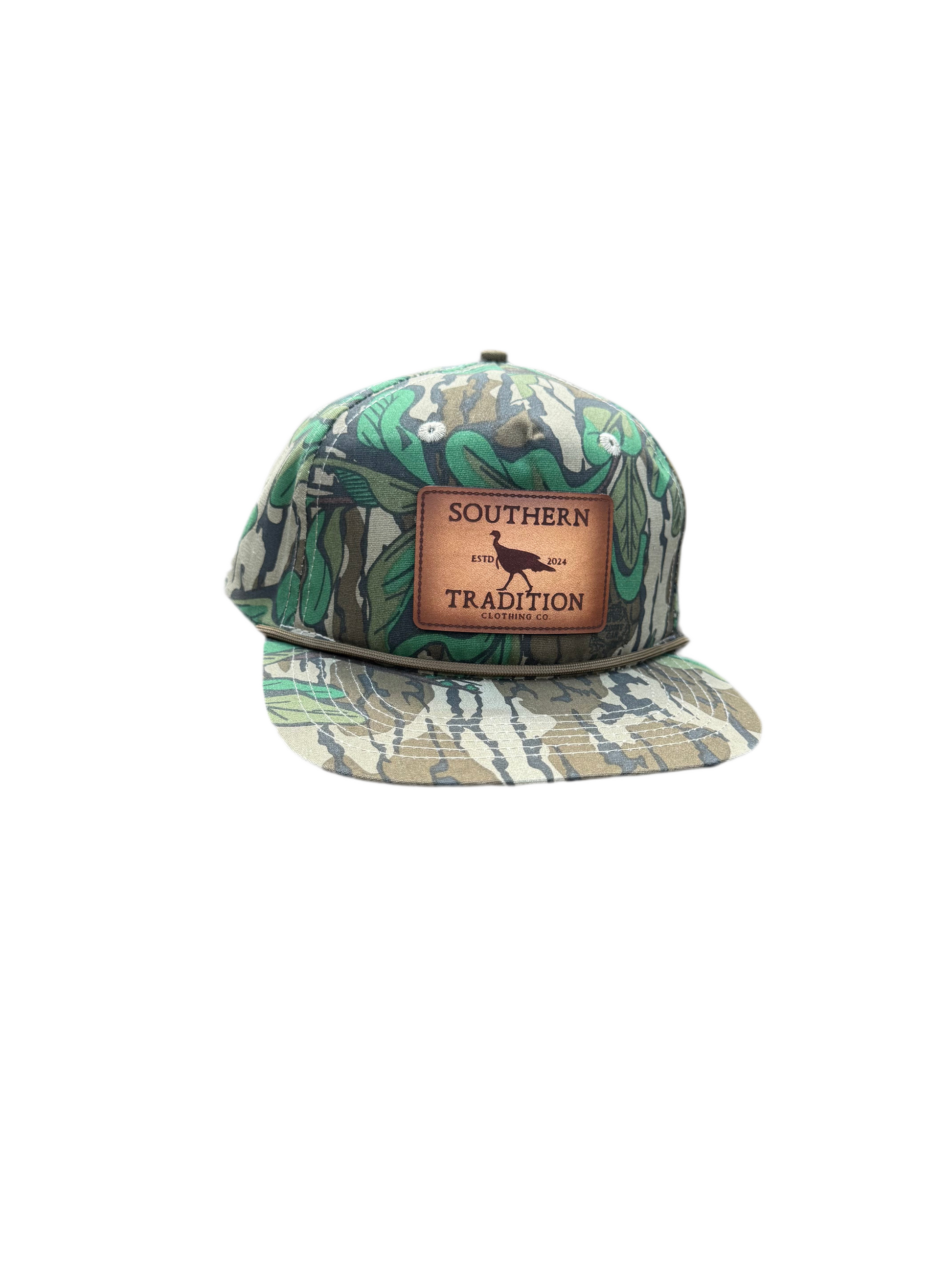 This flat bill with a rope in Mossy Oak Greenleaf features a real leather, custom stained patch engraved with our main logo.