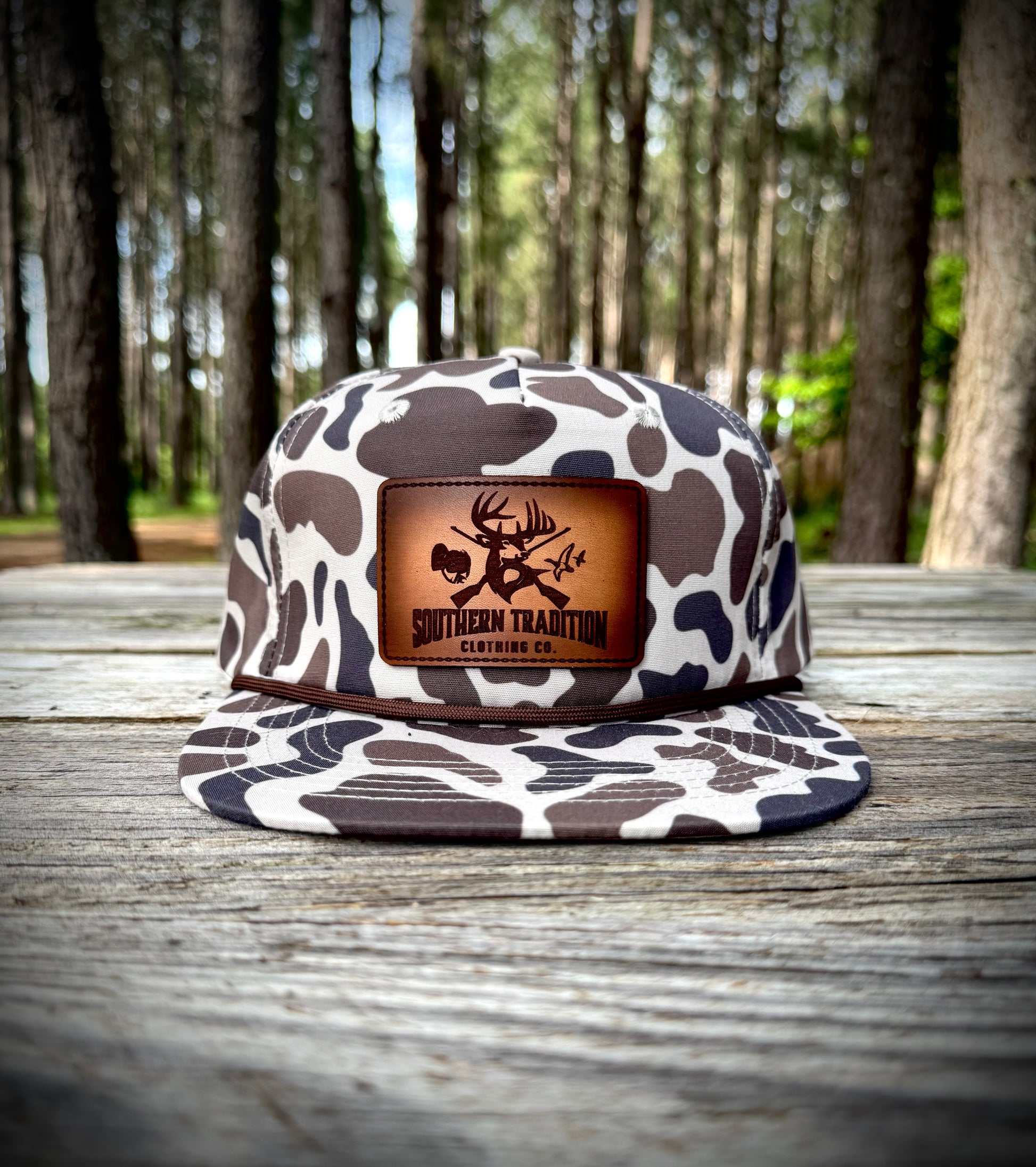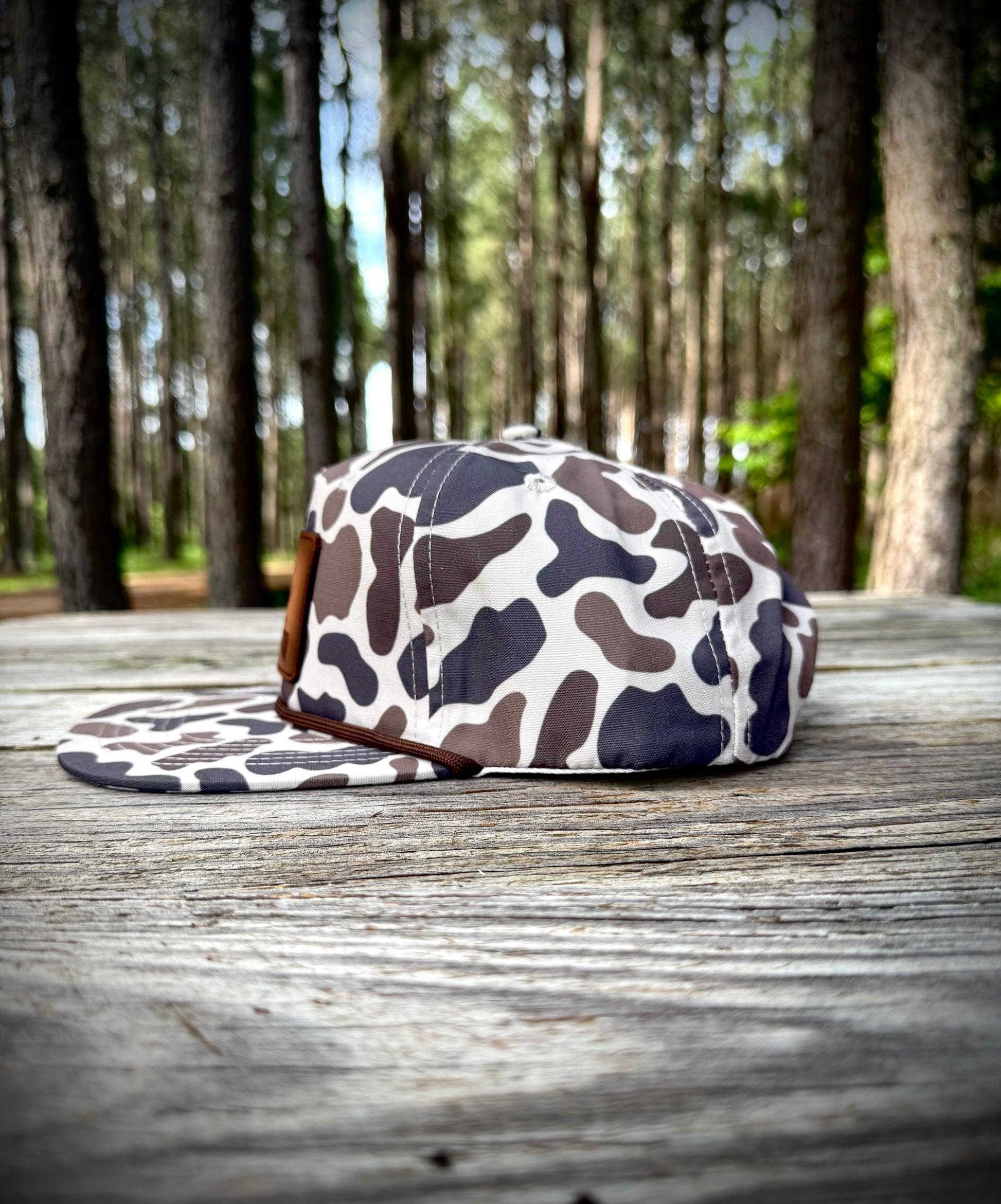 Flat bill cap with a rope in Slough Camo featuring a charcoal patch with our main logo.