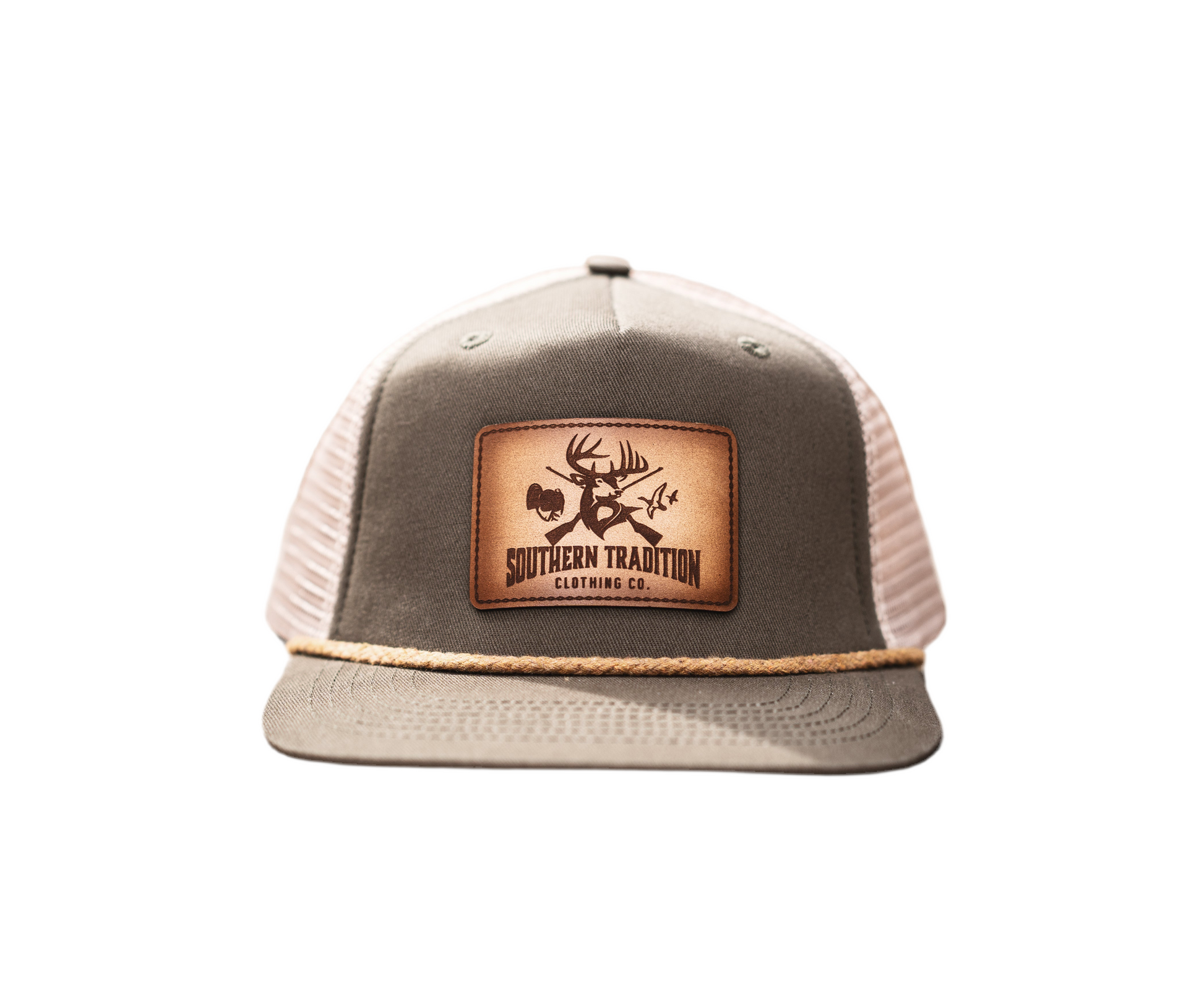 Foam trucker cap with a rope in gator & balsa featuring our custom stained leather patch.